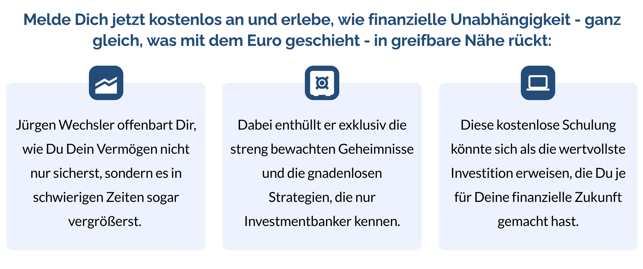 Unsere VERMÖGENSSCHUTZ-MASTERCLASS bietet Ihnen nicht nur die Informationen, die Sie benötigen, um die drohenden Stürme zu überstehen, sondern auch die Werkzeuge, um aus diesen Herausforderungen gestärkt hervorzugehen. Sie verdienen es, in Sicherheit und Wohlstand zu leben, frei von der Last politischer Kurzsichtigkeit und wirtschaftlicher Turbulenzen.